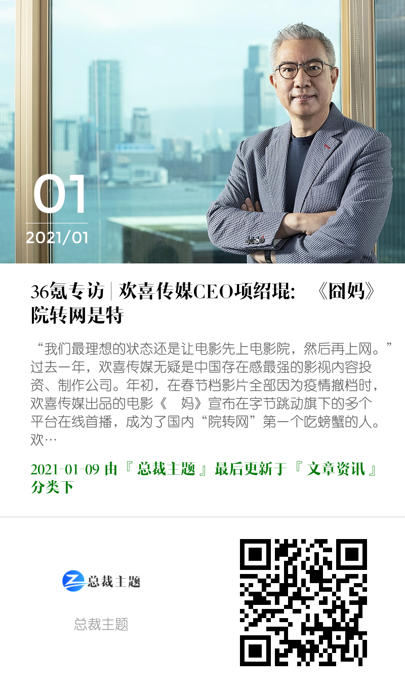在 2020 年的末尾,欢喜传媒 CEO 项绍琨接受了 36 氪的采访。他在 2015 年与董平、宁浩、徐峥联合创办了这家公司,见证了它的上市,并在 2017 年推动了流媒体平台“欢喜首映”的上线。在这场对话中,项绍琨谈到了《囧妈》院转网的影响,也阐述了欢喜传媒选择与猫眼、字节跳动、B 站合作的原因。