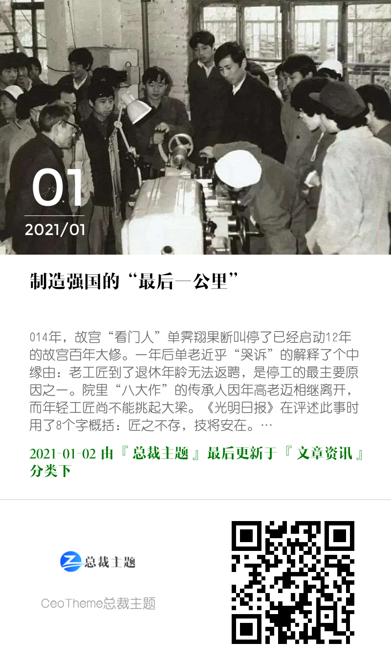 大国产业不仅要“前无古人”,更要“后继有人”。匠能存,技可传——让工匠技艺有序、有效地传承,将是维持中国制造持续攀升的又一项长期性课题。
