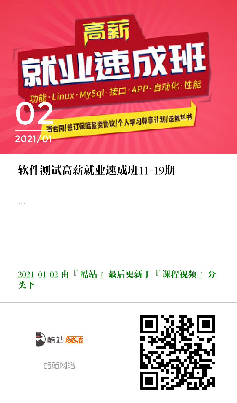 酷站网络 课程视频 软件测试高薪就业速成班11-19期 https://www.zaobj.com/698.html